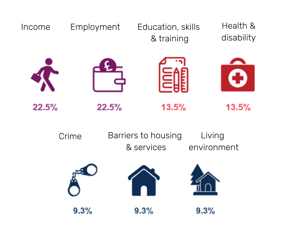 It’s important to know that the domains are not weighted equally – some are given greater importance than others. For instance, employment deprivation is weighted by 22.5%, while barriers to housing and services is weighted by 9.3%.