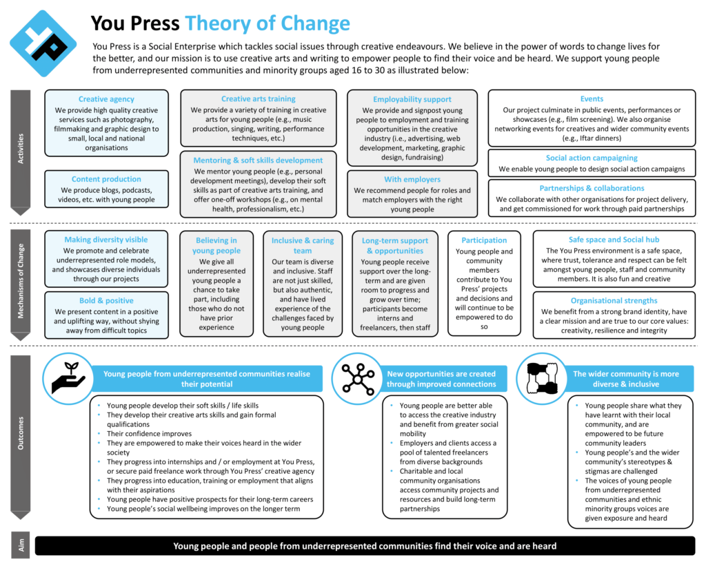 The theory of change will be used to create an evaluation framework for You Press to measure and continue to improve their impact.