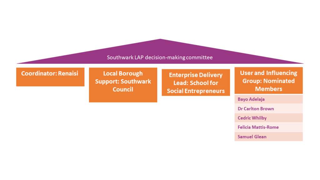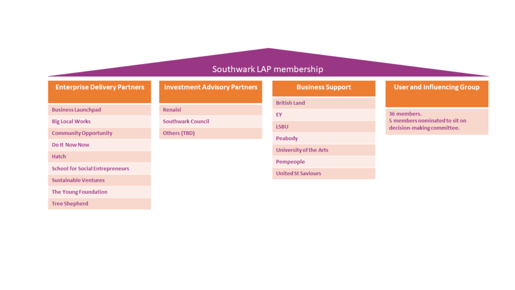 Renaisi has been the coordinating partnership since 2019. It includes Business Launchpad, Big Local Works, Community Opportunity, Do It Now Now, Hatch, School for Social Entrepreneurs, Sustainable Ventures, The Young Foundation, Tree Shepherd, Southwark Council, British Land, EY, LSBU, Peabody, University of the Arts, Pempeople, United St Saviours, and 36 individual members.