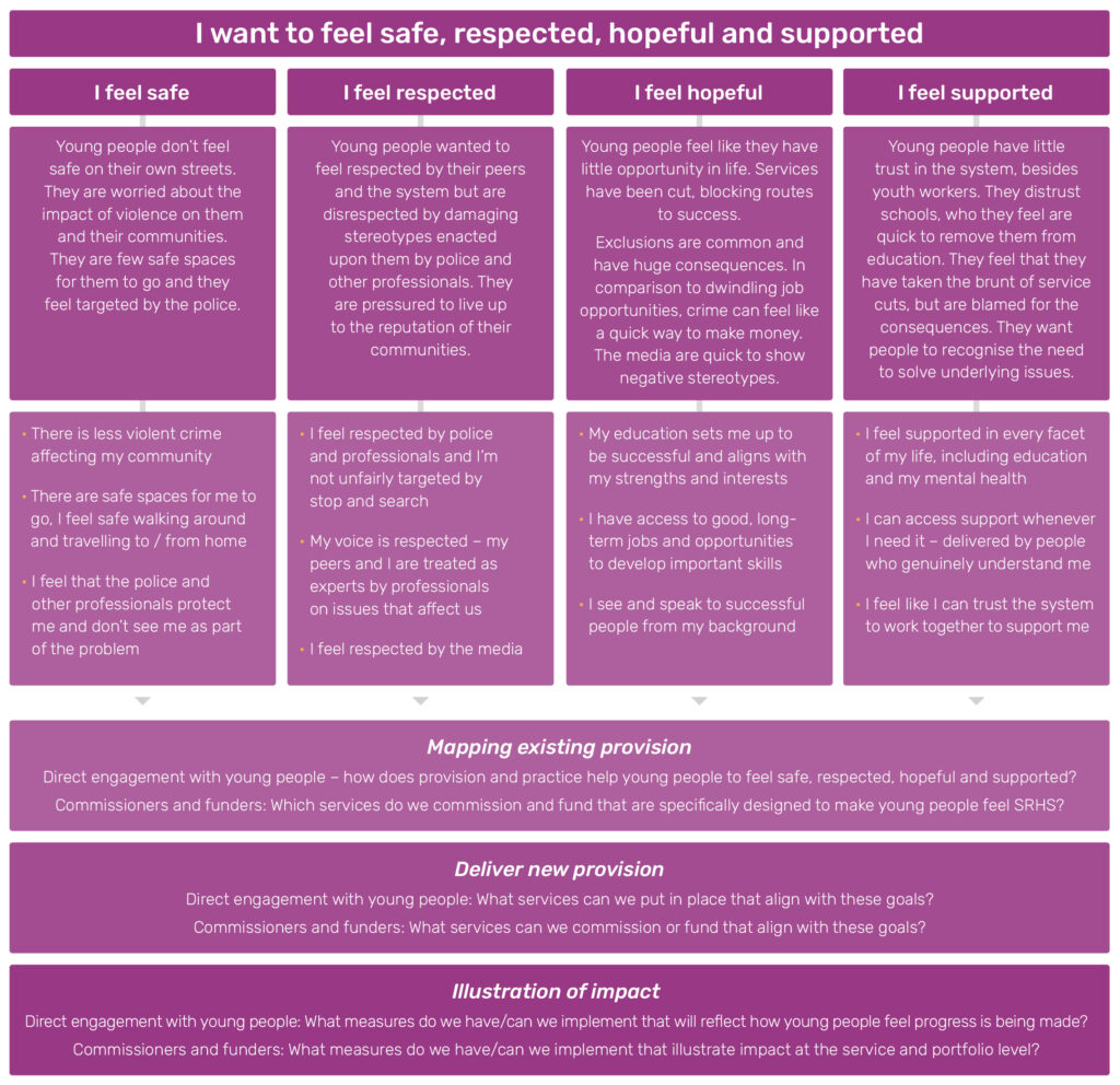 Supported by Social Finance, the group created a Shared Goals Framework bringing together an enormous amount of feedback from young people about how they wanted provision to function, how they wanted to feel, and what the support offered to them should look to achieve.